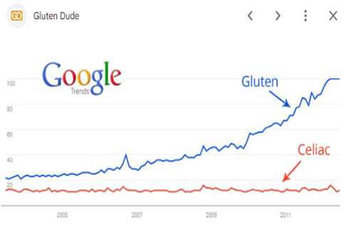 I would wager my last shinny nickel that, save for people with celiac disease, almost nobody is intolerant of gluten, and the reason we believe that gluten intolerance is real is that there is so much money to be made by removing gluten from bread, and the folks that make that money have committed a ton of effort into getting you to believe that gluten is bad for you. The next graph is for effect, it represents the rise of gluten free products against the extremely static prevalence of Celiac Disease in the population.