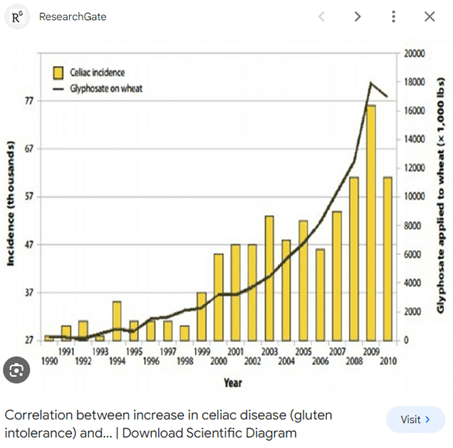 Gluten is not a problem, but I still feel bad when I eat bread, so what the hell is the problem? Is it because the crops that we eat are sprayed with pesticides? Maybe, here’s a graph of Gluten intolerance measured against the rise in use of Glyphosate as a pesticide.